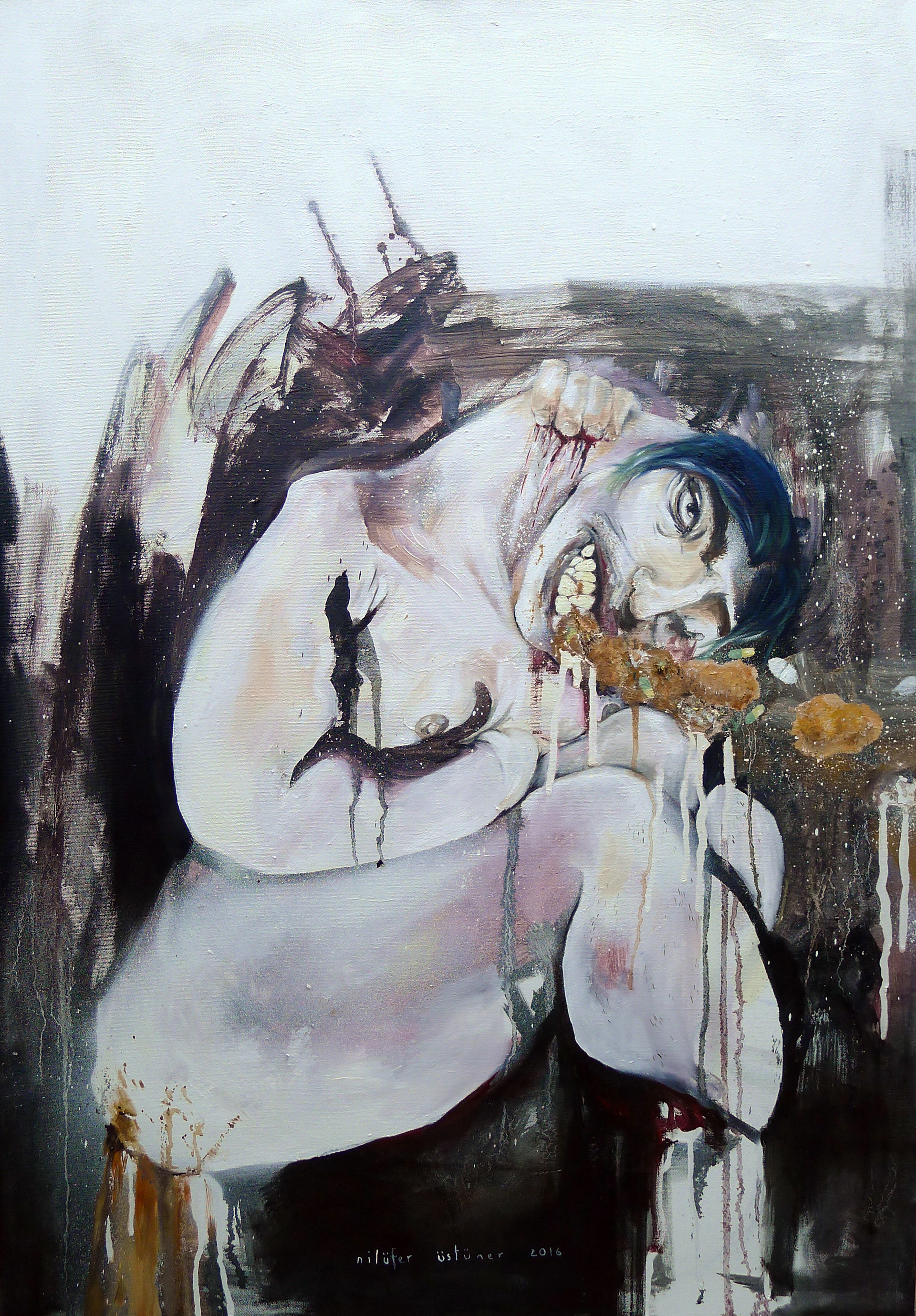 Story of my life. Chronic depression, Anxieties, prozac, nuggets. Oil painting 70 cm x 100 cm